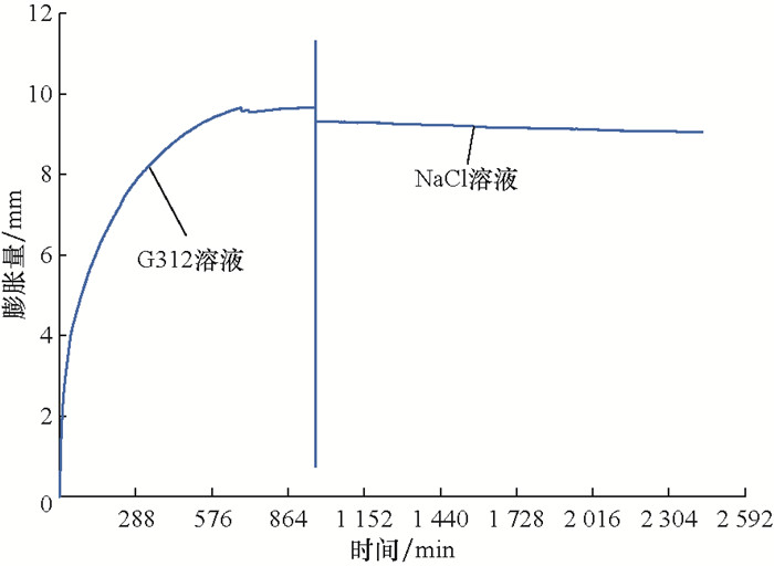 1.1.2 半透膜效果利用OFI页岩膨胀仪进行半透膜试验,按照常规岩心膨胀测试方法,将人工岩心装入膨胀仪,加入多糖衍生物G312溶液,测试岩心的膨胀量,16 h后将膨胀仪中的多糖衍生物G312溶液替换成NaCl饱和溶液,继续测量岩心的膨胀量,结果如图 1所示。
