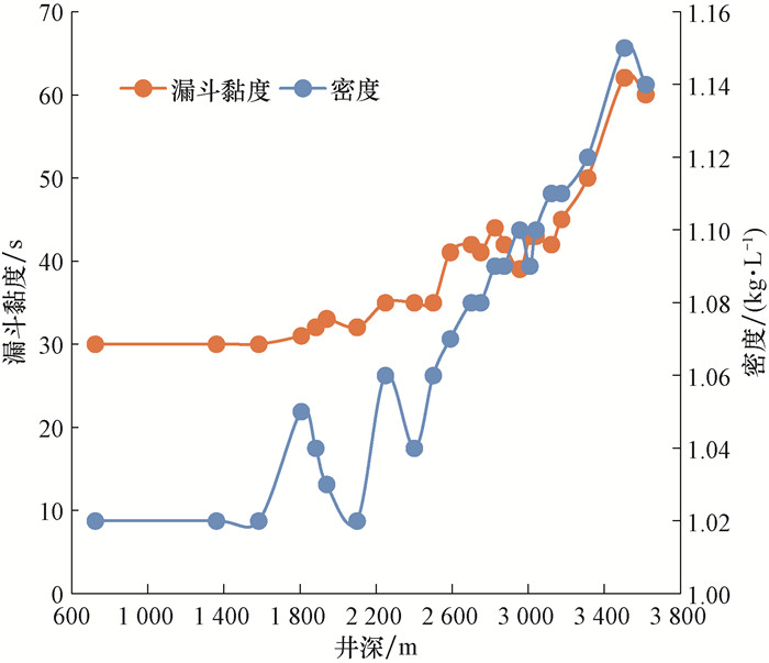 | 图 4 A井二开段钻井液的黏度和密度 Fig.4 Viscosity and density of drilling fluid in the second section of Well A |