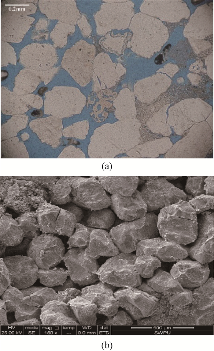 1 储层地质特征 1.1 储层岩石物性和矿物组成特征塔里木盆地A区块志留系砂岩储层的孔隙度主要分布于10%~20%,平均约15%;渗透率主要分布于10~2 000 mD,平均约494 mD。储层岩石以岩屑石英砂岩为主,粒度以细砂和中砂为主。致密度中等,分选性中—好,磨圆度以次圆为主,胶结方式主要为孔隙式,接触关系主要为点-线接触。填隙物平均含量3.42%,其中胶结物2.81%,自生黏土矿物0.61%。胶结物以硅质为主,部分样品钙质、泥质胶结物相对含量较高,胶结强度弱,存在潜在的微粒运移和出砂损害。XRD全岩矿物分析显示,岩石石英含量超过70%,黏土矿物含量约20%,含少量长石、方解石、白云石和黄铁矿。黏土矿物以高岭石和伊/蒙间层矿物为主,平均含量约为74%和16%,存在潜在的速敏、碱敏和水敏损害。