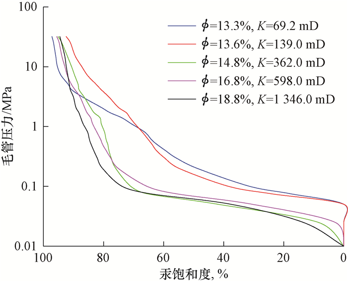 | 图 2 深层中-高渗砂岩储层岩石典型毛管压力曲线 Fig.2 Typical capillary pressure curve of deepmedium-high permeability sandstone reservoir rock |