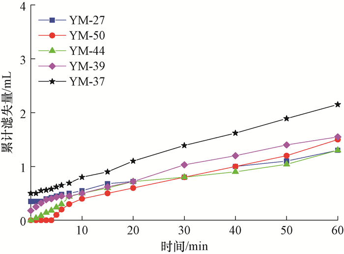 | 图 3 钻井液累计滤失量与时间的关系 Fig.3 Correlation of cumulative filtration of drilling fluid vs.time |