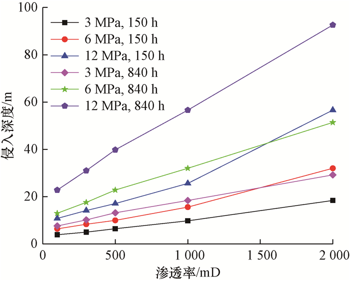 2.3 钻井液滤液侵入深度数值模拟采用文献[25]中的孔隙型储层钻井液滤失侵入带预测模型预测钻井液滤液侵入深度。钻井液滤失侵入带预测模型部分变量赋值如表 3所示。模型涉及基本参数均依据现场钻井完井资料和室内试验进行赋值。钻井液塑性黏度为27×10-3 Pa·s,钻井液固相粒子质量浓度为65 kg/m3,滤饼溶蚀速率为4×10-8 s-1,钻井液动切力为7 Pa。井史资料显示,A区块储层段井底正压差约3~12 MPa,平均约6 MPa,储层段浸泡时间直井约6 d,水平井约35 d。因此,笔者模拟正压差分别为3,6和12 MPa时直井和水平井钻井液滤液侵入深度(滤失时间直井取150 h,水平井取840 h),结果见图 4。由图 4可以看出:A区块采用聚磺混油钻井液钻进中-高渗砂岩储层,150 h钻井液滤液的侵入深度为3.90~56.60 m,840 h钻井液滤液的侵入深度达7.60~92.60 m,损害范围较大;正压差越大,浸泡时间越长,钻井液滤液侵入深度越深。