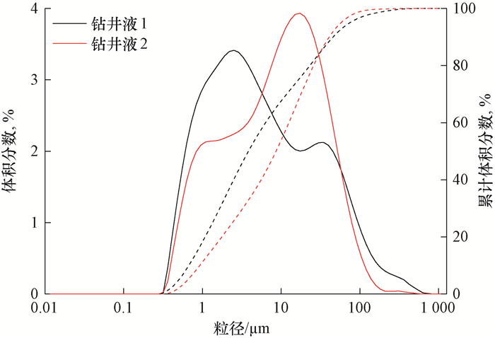 3.1 固相堵塞根据储层损害室内评价结果,现用钻井液的储层保护性能较差是造成深层中-高渗储层钻井完井损害的主要原因。钻井液的储层保护性能较差,表现为钻井液滤饼封堵能力和承压能力不足。动态损害试验岩样累计滤失量随试验时间增长持续增大,表明钻井液对储层的屏蔽暂堵效果不理想,无法形成渗透率接近于0的屏蔽暂堵带。A区块现用2种聚磺混油钻井液,钻井液1的配方如2.2节所述,钻井液2的配方为3.0%~4.5%膨润土+0.3%~0.5%烧碱+3.0%~5.0%磺化酚醛树脂+3.0%~5.0%磺化褐煤树脂+3.0%~5.0%防塌剂+3.0%~5.0%润滑剂+加重剂+4.0%~6.0%油层保护剂+4.0%柴油。固相粒度分析表明:2种钻井液固相颗粒粒度均呈双峰分布;钻井液1固相颗粒粒径主峰为2.50 μm,次峰为34.70 μm,D90为52.38 μm;钻井液2固相颗粒粒径主峰为17.37 μm,次峰为1.00 μm,D90为40.68 μm(见图 5)。与储层孔隙主要直径11.30~150.00 μm和渗透率主要贡献孔喉直径3.20~126.00 μm相比,小粒径固相颗粒含量充足,但大粒径固相颗粒明显不足。