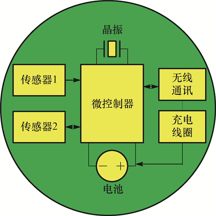 1 示踪器无线充电设计方案示踪器通过钻柱水眼连续投放到循环的钻井液中,从钻头水眼进入井筒,随钻井液循环从环空上行返至地面,采集井筒中的温度和压力,从而建立井筒温度和压力分布剖面[8]。由于钻头水眼的直径非常小,为确保示踪器顺利通过钻头水眼进入环空段进行测量,示踪器样机为直径7.5 mm的小球,其密度约1.5 g/cm3,耐温可达100 ℃,耐压可达70 MPa。示踪器内部包含微控制芯片、微型传感器、微型电池和电阻电容等元器件,内部电路如图 1所示。由于示踪器内部的空间非常有限,要求示踪器内每一个元器件(模块)的尺寸尽可能小、功耗尽可能低,同时能够承受井下的高温高压,并且相对较容易组装。