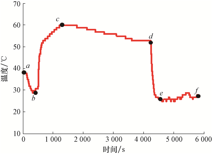 试验井通井后,在接单根的间隙向钻杆内投入10个示踪器(只能测量温度),并将钻头提至离井底3.00 m远的位置,以便示踪器从钻头喷嘴出来后有一个缓冲距离,以降低其对井底地层的冲击力。示踪器入井大约10 min后,将钻头下放至井底,这段时间内示踪器已经安全到达井底。示踪器入井约30 min后(钻井液迟到时间约为40 min),开始在振动筛钻井液出口处打捞示踪器,打捞示踪器的时间持续了2 h,比2个钻井液迟到时间略长。最终打捞到1个示踪器,其外观完好无损。示踪器记录了时长6 000 s的温度数据(见图 10),说明示踪器记录的温度数据是完整的,获得了整个井筒的温度分布曲线。