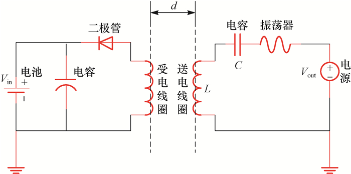 示踪器的无线充电电路原理如图 3所示。示踪器内部有1个锂电池、1个受电线圈、1个二极管和1个旁路电容。无线充电装置内部有1个送电线圈、1个谐振电容、1个高频振荡器和1个直流电源。无线充电装置的送电线圈L和谐振电容C构成串联谐振电路,谐振电路的固有频率为