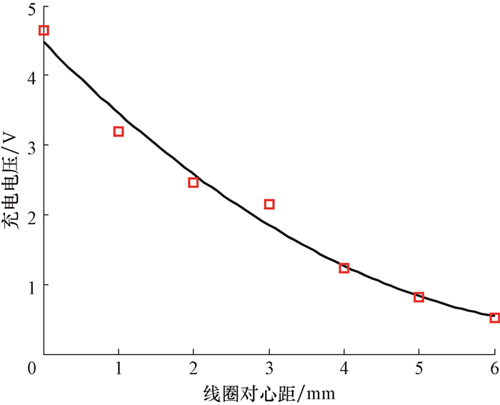 由图 6可以看出,线圈对心距越大,充电电压越低,二者之间呈斜率为-0.7的线性关系,即线圈对心距增加1.0 mm,充电电压就会降低0.70 V。当线圈对心距增大到2.0 mm时,充电电压降至2.47 V,此时线圈对心距不能再增大,否则就不能给锂电池充电了。这说明,当送电电压为10.00 V时,线圈对心距不宜超过2.0 mm。如果线圈对心距超过2.0 mm时,则要升高送电电压。