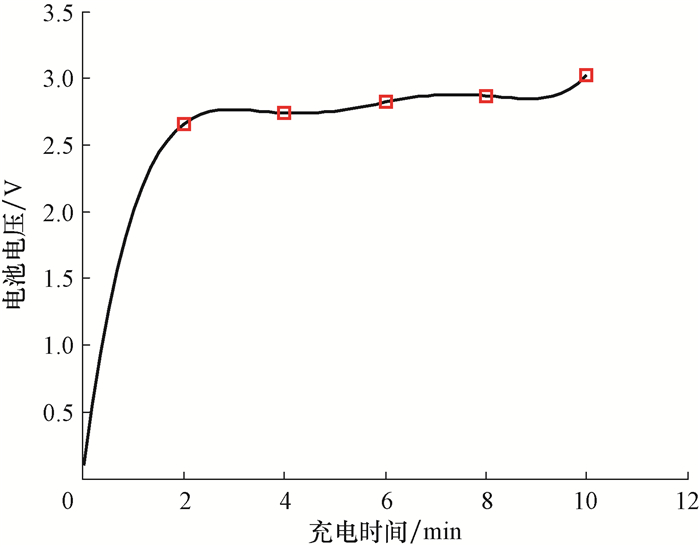2.3 电池电压和充电时间的关系考虑到充电时间太短会导致锂电池充电不充分,而充电时间过长又不利于现场使用,因此有必要了解锂电池的最佳充电时间。设定充电过程中线圈对心距为1.0 mm,送电电压为7.00 V,此时充电电压为3.39 V,用该电压给锂电池充电10 min,每隔2 min取下锂电池测一次电池电压,结果见图 7。锂电池充电之前的电压为0.10 V。