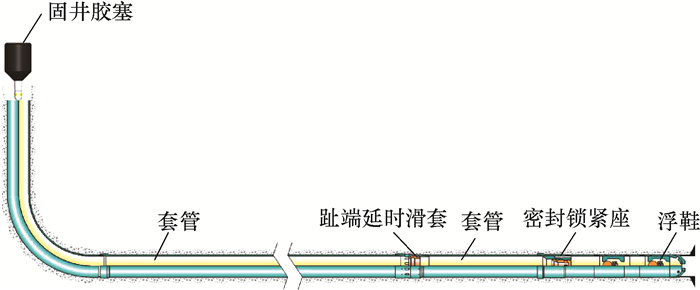 1 水平井趾端压裂技术原理水平井趾端压裂技术是在套管柱上预置趾端压裂工具,与套管柱一起下入井内,压裂施工时无需下入其他工具即可实现水平井首段压裂施工[15],水平井趾端压裂管柱从水平井底部开始依次为浮鞋、密封锁紧座、套管、趾端延时滑套和套管(至井口),如图 1所示。
