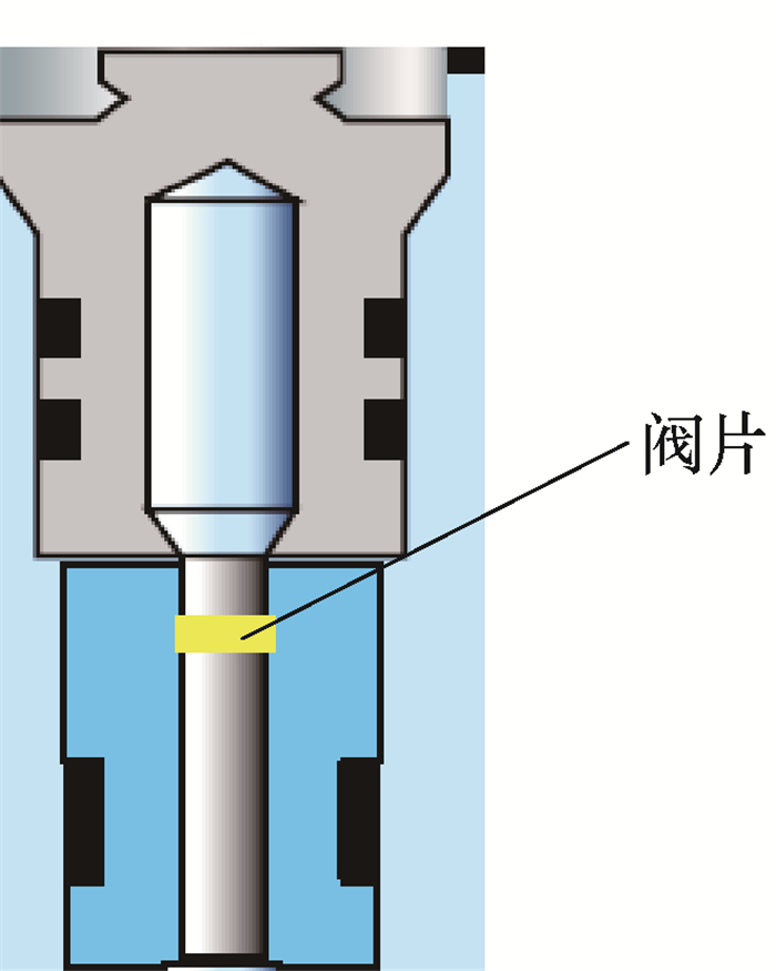 滑套的打开机构主要由爆破阀单元和活塞单元组成。其中, 爆破阀是打开滑套的关键部件,如图 3所示,当压力达到爆破阀启动压力时,阀片破裂,压力传导到活塞上,活塞在液压作用下移动,直至滑套完全打开。因此,爆破阀启动压力的误差关系到延时滑套能否在设定压力下顺利打开。影响爆破阀启动压力的因素主要包括阀片材质、阀片面积、加工工艺和破裂方式等[11]。