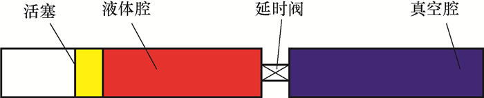 2.1.2 延时控制系统延时控制系统主要由活塞、液体腔、延时阀和真空腔组成,如图 4所示。通过设计液体腔和真空腔,利用活塞推动液体在两腔之间进行单向定量流动,实现延时。