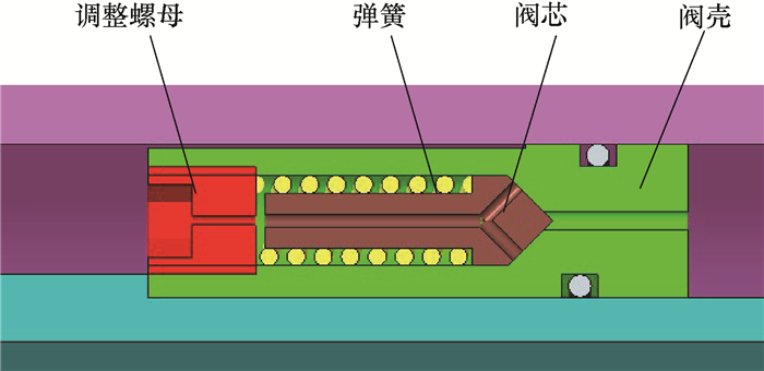 延时阀是延时控制系统的核心部件,其性能直接影响滑套的可靠性,其结构如图 5所示。通过调整阀体开度,调节流体流动速度、压力,精准控制延时时间,可实现延时15~40 min。其中, 阀芯及密封组件需满足耐高温(150 ℃)和耐高压(100 MPa)的要求。延时阀通过控制液体腔内液体排出的速度来控制滑套打开时间,以起到延迟打开的功能。因此,延时阀控制滑套打开时间(液体腔内液体排出的时间)的计算公式为: