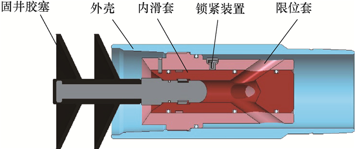 2.2 密封锁紧座密封锁紧座主要由外壳、限位套、内滑套、锁紧装置和配套固井胶塞等部件组成,如图 6所示。与常规碰压短节不一样的是,配合趾端延时滑套使用的密封锁紧座要求一次碰压成功且碰压后实现锁紧密封,只有这样才能确保在套管柱内形成密封腔。同时,该短节在随套管柱下入过程中,需要具备正反循环功能,避免循环时井内污物在密封锁紧座处沉积造成堵塞和循环不畅等问题,防范固井结束后发生环空水泥浆倒返、井喷和井涌等风险。