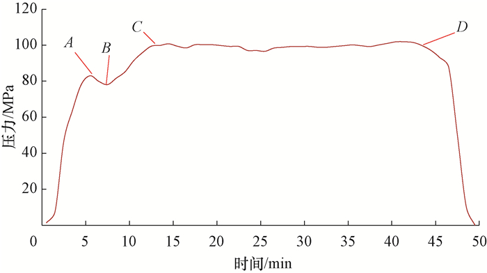 试验时,趾端延时滑套安装在模拟试验井筒内,以清水为介质,通过连接加压泵将清水注入滑套内,测试滑套延时时间及打开压力,结果如图 7所示。试验表明,爆破阀在压力达到82.0 MPa时启动(见图 7中点A),启动之后压力有所下降(见图 7中点B),此时延时滑套的内活塞开始移动并挤压液体腔内的液体开始延时,继续提高压力至滑套额定工作压力105.0 MPa左右(见图 7中点C);在此压力下,滑套稳定延时约29 min后压力开始下降(见图 7中点D),滑套内活塞完全打开,压力瞬间降至0 MPa。试验结果表明,滑套爆破阀启动压力和滑套延时打开时间均符合设计要求。