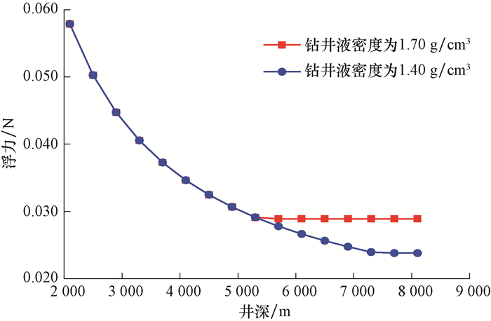 模拟顺南地区井下条件(地温梯度为2.8 ℃/100m,液态天然气密度为0.42 g/cm3),利用理想状态方程计算了地面状态下单位体积(1L)天然气在不同钻井液密度和井深下所受浮力,结果见图 1。从图 1可以看出,随着井深增加,天然气受到温度和压力的双重影响,体积处于不断压缩的状态,所受浮力不断减小,直至其体积不能被继续压缩、达到液态密度时,所受浮力则保持不变。天然气达到液态密度前在2种密度钻井液中所受到的浮力大小相同;天然气达到液态密度后,其浮力随钻井液密度升高而增大。