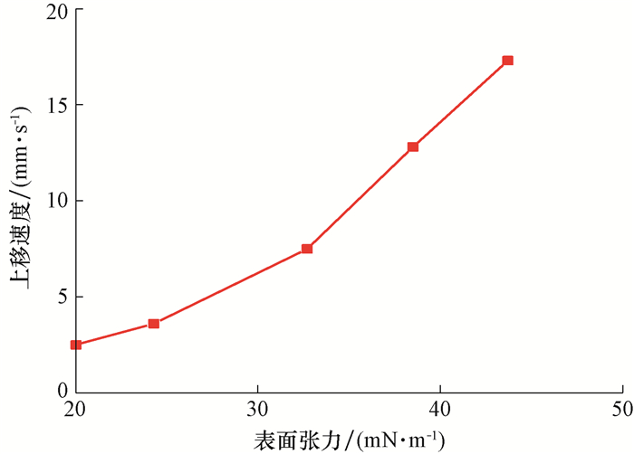 为了了解表面张力对气体上窜速度的影响,测试了中空低密度小球在不同表面张力的十二烷基苯磺酸钠溶液中的上移速度,结果如图 2所示。从图 2可以看出,在相同条件下,气泡上升最终速度随着溶液的表面张力增大而增大。这是因为,气泡在上升过程中前端表面活性剂浓度不断稀释、尾端浓度不断积累,导致气泡表面产生表面活性剂浓度梯度及表面张力梯度[6]。溶液浓度越小,表面张力越大,气泡表面的浓度梯度和表面张力梯度越小,导致阻力减小,最终使气泡上升速度增大。