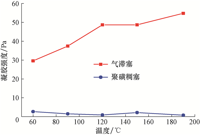 从图 3可以看出,聚磺稠塞在190 ℃下的凝胶强度在2 Pa左右,表明其在高温下基本失去了气滞能力;气滞塞凝胶强度随着温度升高由30 Pa增至55 Pa,气滞效果得到进一步增强。