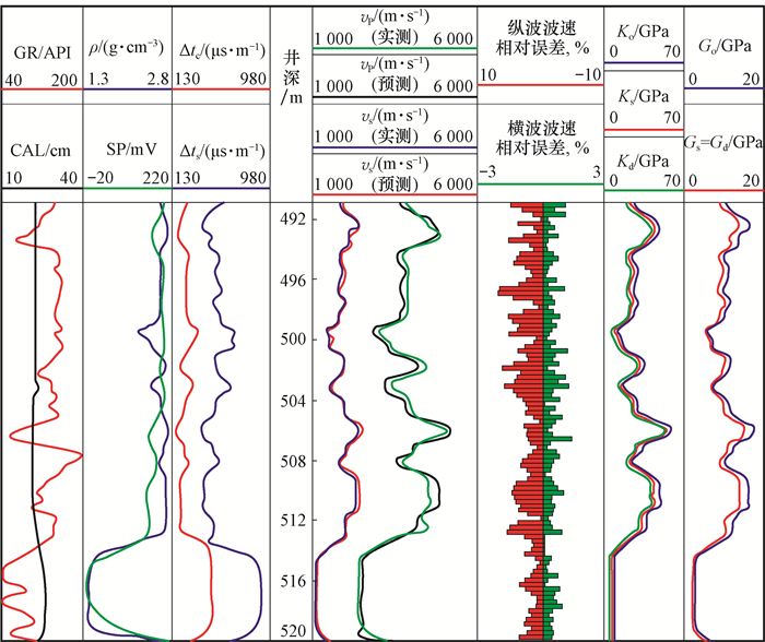 以研究区HG17-2井为例,利用寻优算法提取山西组煤系致密砂岩储层岩石的模量参数,结果如图 2所示。该井491.00~512.00 m井段为煤系碎屑岩地层,512.00~520.00 m井段为煤岩地层。从图 2可以看出,预测纵横波波速与实测纵横波波速的平均相对误差分别为4.00%和2.83%,因此各模量参数提取结果可靠。