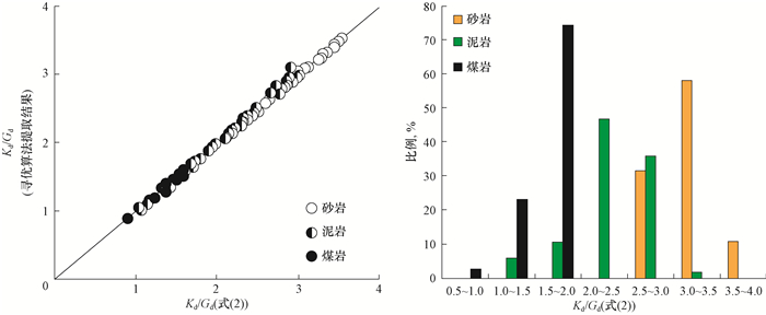 在提取了目的层各模量参数后,利用DEM模型求取了地层岩石的α。对利用寻优算法所提取的岩石Kd/Gd与式(2)的计算结果进行了对比,两者相符度较高(见图 3),表明利用式(2)所求取的α可靠。由图 3可以看出:砂岩的Kd/Gd相对高一些,通常大于2.5,峰值约为3.3;泥岩次之,Kd/Gd主要分布在1.0~3.3,峰值约为2.4;煤岩的KdGd相对较小,通常小于1.8,峰值约为1.6。