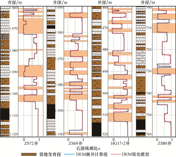 利用DEM模型对均匀分布在研究区的50口井的山西组地层的α进行了预测,部分井的预测结果见图 4。从图 4可以看出:利用该方法预测的裂缝发育程度与岩心裂缝观察结果基本一致,两者的符合率约达到90%,表明该方法适用于预测研究区煤系致密砂岩储层的裂缝;对于α小于0.1的裂缝性地层,砂岩段所占比例较高,表明裂缝主要在砂岩中发育,而泥岩地层则具有较好的封闭能力;裂缝性地层的α通常小于0.001,表现为无限狭长裂缝形态,表明裂缝延伸较长或具有较小的开度,这与显微镜下所观察到山西组岩心裂缝形态是一致的。