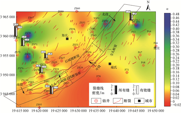 研究区山西组主要发育4个砂组,其中Ⅱ砂组的裂缝发育程度最高,勘探潜力最大。笔者以Ⅱ砂组为例,利用测井资料对该砂组的裂缝平面分布特征进行预测,结果见图 5。由图 5可以看出:Ⅱ砂组的α整体较低,表明裂缝较为发育;α较小的裂缝强发育区主要分布在中南部地区及北部局部地区;该地区最大的2条边界断裂(寺头断裂及后城腰断裂)所组成的寺头-后城腰走滑断裂带的中段和南段附近地区岩石的α较低,裂缝最为发育;而该走滑断裂带北段的α相对高一些,表明裂缝发育程度相对低一些;寺头-后城腰走滑断裂带中段和南段的断距普遍大于200.00 m,断裂活动性强;而其北段的断距通常小于150.00 m,断距相对较小。这是造成该断裂带中-南段与北段裂缝发育程度出现较大差异的重要原因。